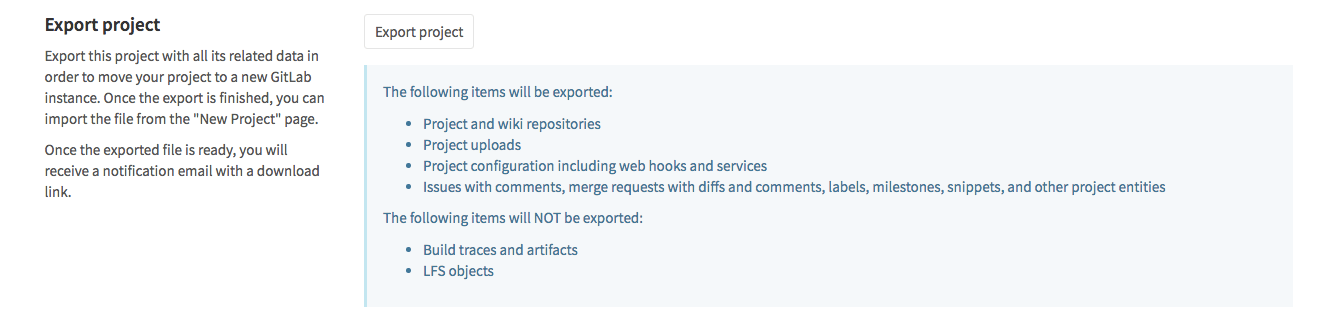 - Issues with comments, merge requests with diffs and comments, labels, milestones, snippets, and other project entities